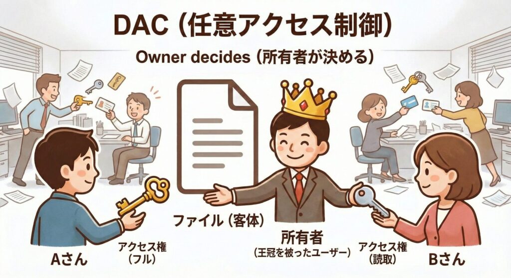 DAC(Discretionary Access Control:任意アクセス制御)は、その名の通り、リソース(ファイルやディレクトリ)の所有者(オーナー)が、自分の裁量(Discretion)でアクセス権限を設定できる方式です。