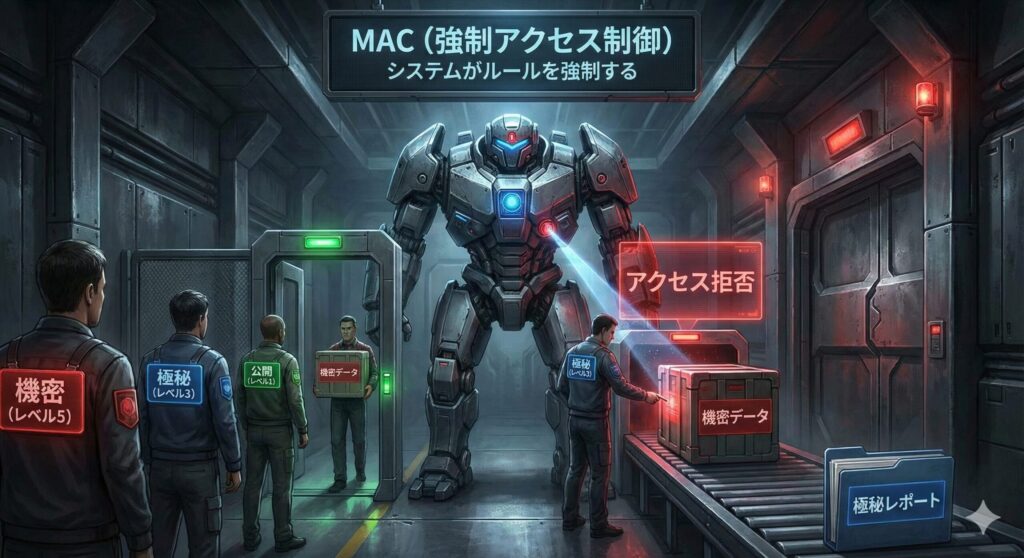 MAC(Mandatory Access Control:強制アクセス制御)は、DACの「所有者任せ」に対するアンチテーゼとして生まれた、非常に厳格なモデルです。ここでいう「Mandatory(強制的)」とは、リソースの所有者であっても変更できない、という意味です。