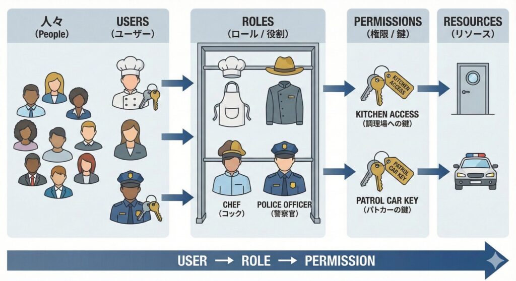 RBACの最大の特徴は、ユーザーと権限を直接結びつけないことです。間に「ロール(Role:役割)」というクッションを挟みます。
