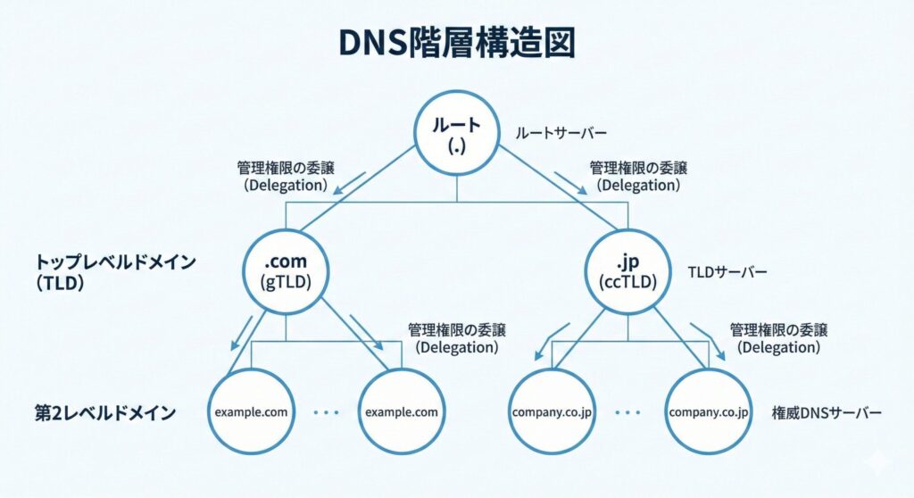 この階層構造により、ドメイン名の管理権限を委譲(Delegation)することが可能となり、インターネットの拡張性を支えています。各階層で管理責任を分散することで、世界規模のシステムとして機能しているのです。