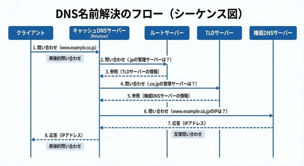 具体的な例として、クライアントが www.example.co.jp にアクセスする場合の流れを見てみましょう。まず、クライアントはキャッシュサーバーに問い合わせます。キャッシュサーバーはルートサーバーに .jp の管理サーバーを尋ね、ルートサーバーは .jp のDNSサーバーのIPを返します。次に、キャッシュサーバーは .jp のDNSサーバーに .co.jp の管理サーバーを尋ねます。これを繰り返し、最終的に example.co.jp の権威サーバーからWebサーバーのIPアドレスを取得します。キャッシュサーバーは結果をクライアントに返し、同時にその情報をキャッシュします。