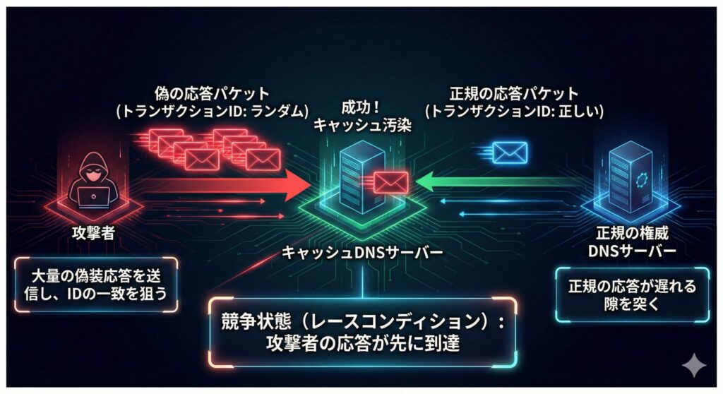 この時、正規のサーバーが応答を返すまでの「わずかな隙」を狙い、攻撃者は大量の偽の応答パケットをキャッシュサーバーに送りつけます。偽のパケットには、正規のサーバーになりすました送信元IPと、攻撃者が推測したトランザクションIDが含まれています。