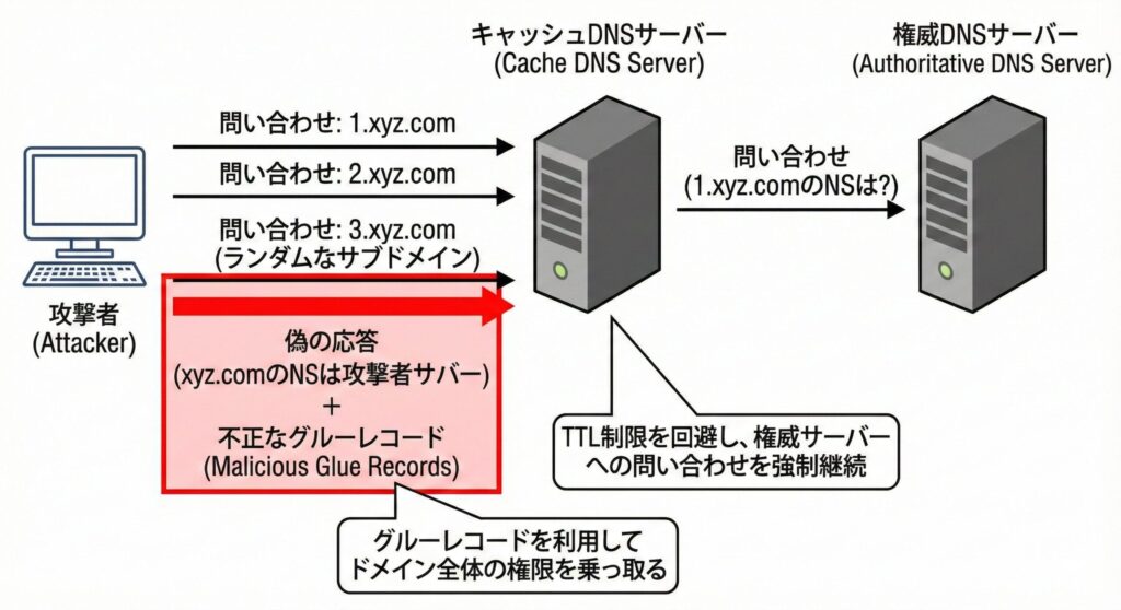 もし攻撃が失敗しても、問い合わせたサブドメイン(1.bank.example.com)がキャッシュされるだけで、ターゲットドメイン全体の権限情報はキャッシュされません。したがって、攻撃者はTTL待ちをすることなく、次々と異なるサブドメインで攻撃を試行できます。成功するまで無限に試行を続けられるのです。