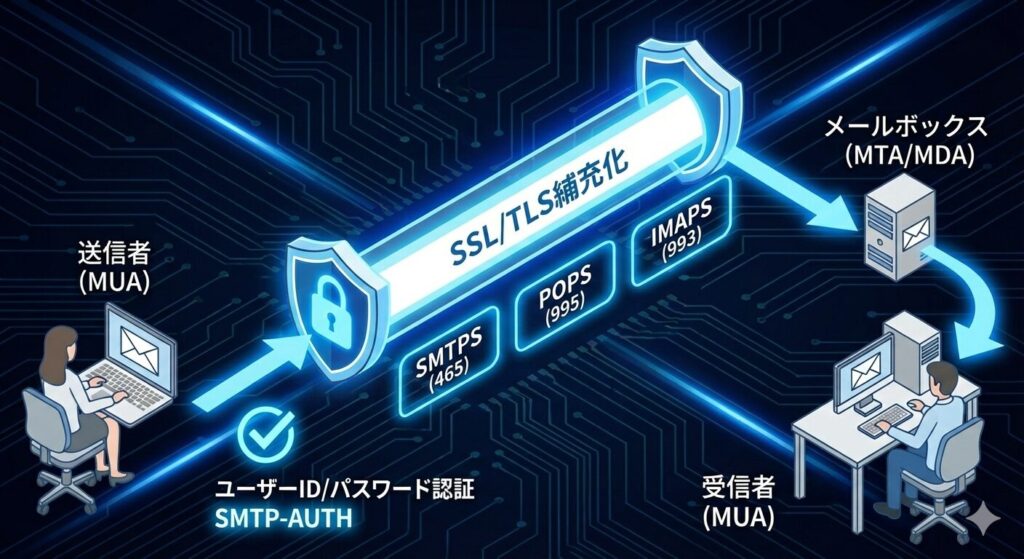 - 暗号化(SSL/TLS):SMTPS/POPS/IMAPSを利用することで、通信経路をトンネル化し、盗聴とパスワード漏洩を防ぐ