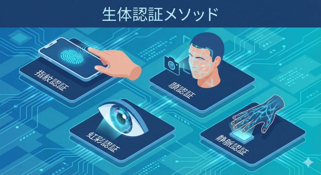 生体認証(Biometrics)とは、人間の身体的特徴や行動的特徴を用いて本人確認を行う技術です。認証の3要素である「知識(パスワード)」「所持(ICカード)」「生体(存在)」のうち、生体にあたります。