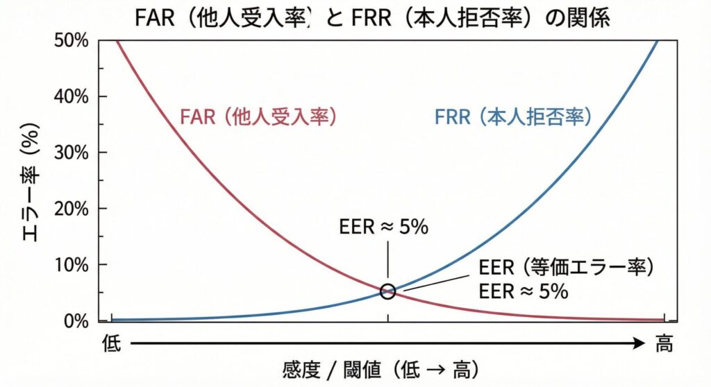 FRRとFARはトレードオフの関係にあります。セキュリティを厳しくしようとして判定の閾値を上げると、他人は通さなくなります(FAR低下)が、本人であっても少し指が濡れているだけで拒否されるようになります(FRR上昇)。逆に、利便性を優先して閾値を下げると、スムーズに認証できます(FRR低下)が、似ている他人を通してしまうリスクが高まります(FAR上昇)。
