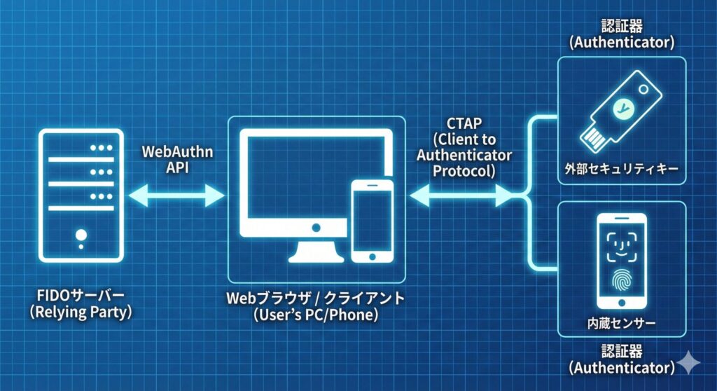 • FIDOオーセンティケータ(認証器): ユーザー側のデバイス(スマホの指紋センサーやYubiKeyなどのセキュリティキー)で、秘密鍵を生成・管理し、生体認証を実行