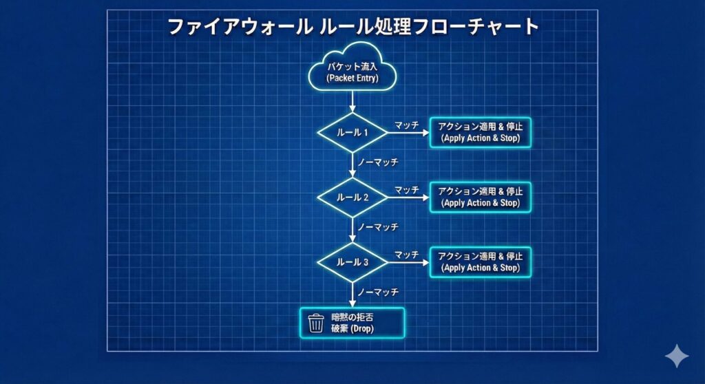 ファイアウォールのルールは、リストの上から順番に評価されます。そして、一度マッチしたら、それ以降のルールは無視されます(First Match方式)。