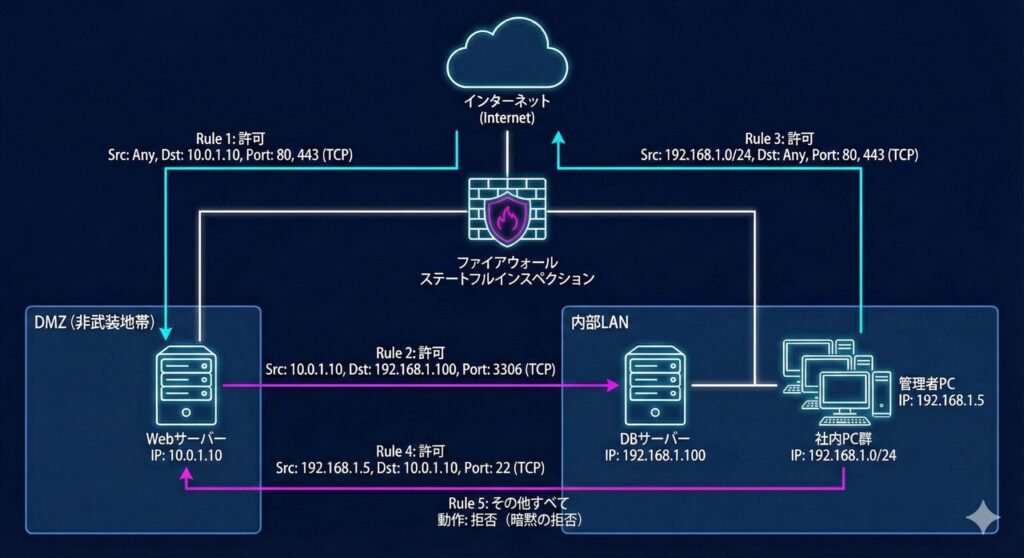 この設定のポイントは、「最小権限の原則」に基づいていることです。必要最小限の通信のみを許可し、それ以外はすべて遮断します。特に、インターネットから内部LANへの直接通信は一切許可していない点に注目してください。