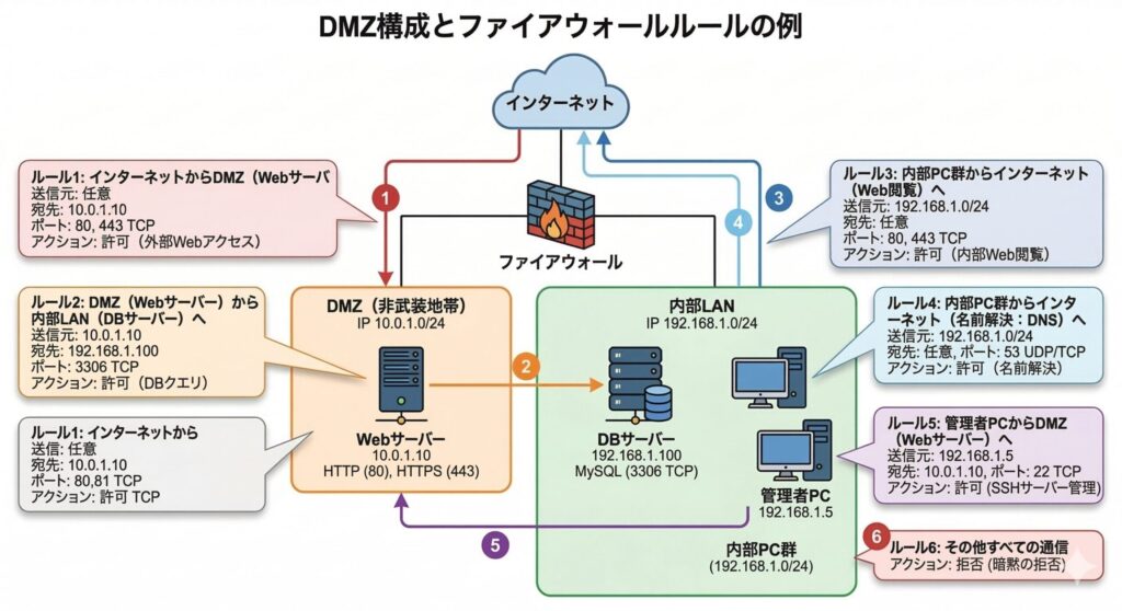 この設定のポイントは、「最小権限の原則」に基づいていることです。必要最小限の通信のみを許可し、それ以外はすべて遮断します。特に、インターネットから内部LANへの直接通信は一切許可していない点に注目してください。