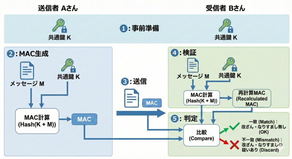 MACは、ハッシュ関数による「完全性(改ざん検知)」に加え、共通鍵を使うことで送信者が鍵を知る本人であるという「真正性(なりすまし検知)」も保証します。