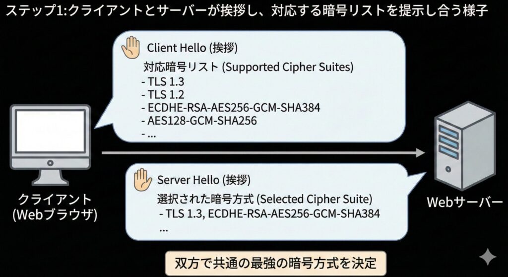 この時、お互いに「自分はこんな暗号技術に対応していますよ」とリストを見せ合い、共通して使える最も安全な方式を選びます。