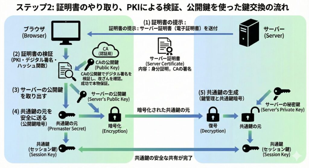 ステップ2 : サーバー認証と鍵交換(信頼の確認と共通鍵の準備)