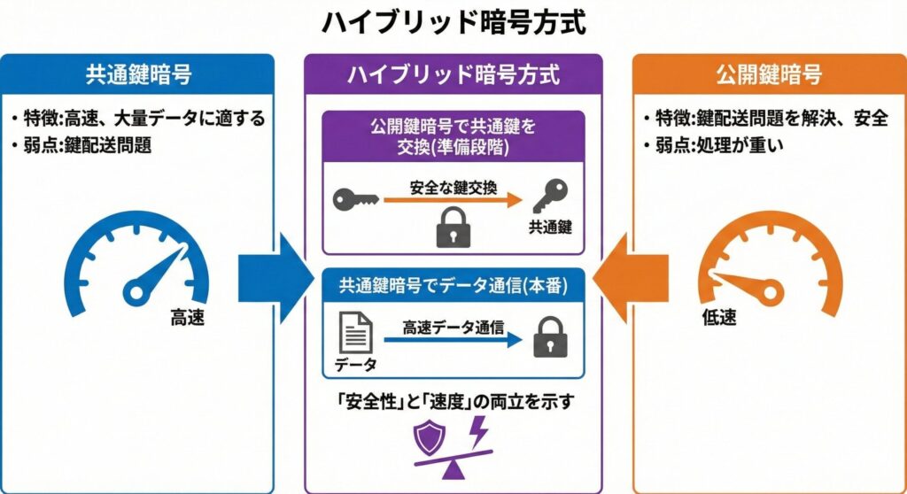 そこで、HTTPS通信ではハイブリッド暗号方式を採用しています。