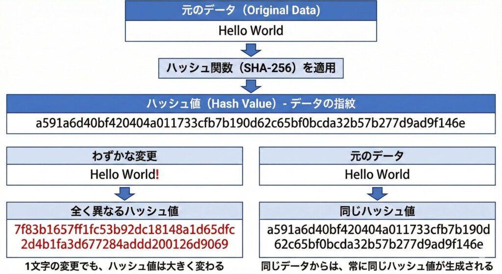 ハッシュ関数(SHA-256など)は、どんなデータからも固定長の「ハッシュ値」を生成する関数です。