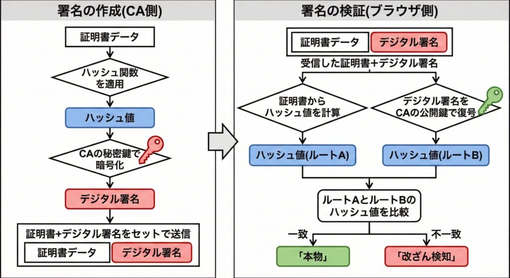 - 両方が一致すれば、「この証明書はCAが署名した本物で、改ざんされていない」と確認できる