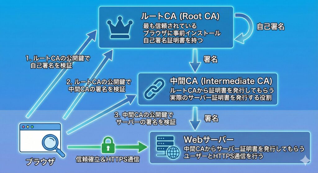 この「信頼の連鎖」により、インターネット全体で一貫した認証の仕組みが実現されています。