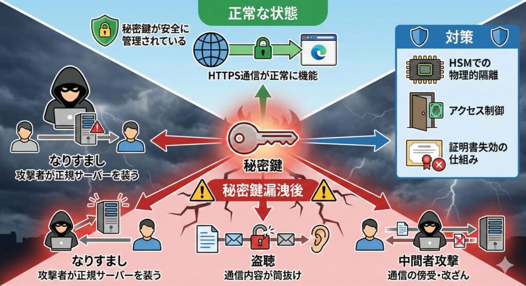 もしサーバーの秘密鍵が攻撃者の手に渡ったら、次のような事態が発生します。
