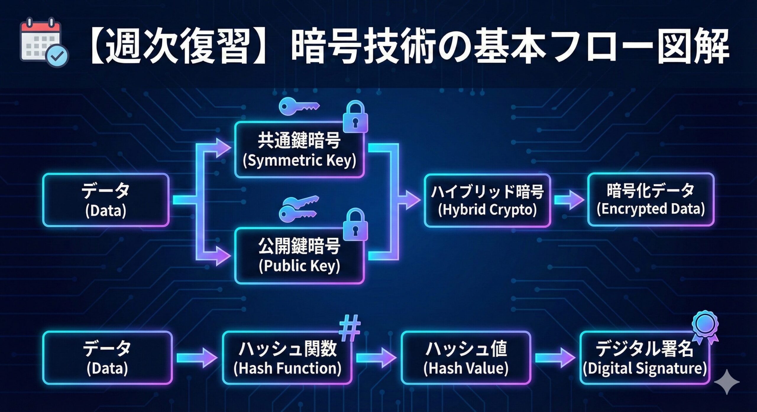 「共通鍵暗号は速いけど鍵の配送が大変。公開鍵暗号は安全だけど処理が重い。ハッシュ関数は改ざん検知に使えて、デジタル署名は本人確認に…」