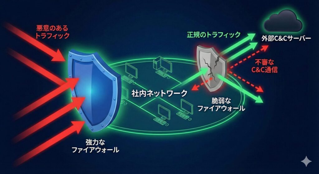 多くの組織では、外部から入ってくる通信(インバウンド)は厳しく制限していますが、内部から出ていく通信(アウトバウンド)は「社員がWebを見るから」と甘く設定しがちです。