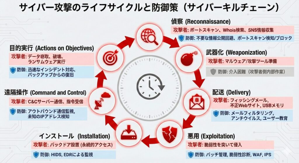 サイバー攻撃は、通常いくつかの段階を経て実行されます。この「攻撃のライフサイクル」を理解することで、各段階での効果的な対策が見えてきます。
