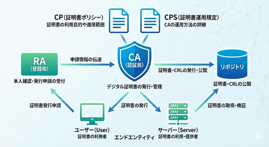 PKIは、複数の要素が有機的に連携することで機能しています。主な構成要素を理解しておきましょう。