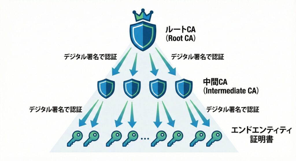 PKIの信頼性は、CAの階層構造によって支えられています。この仕組みを理解することは、PKI全体を理解する上で非常に重要です。