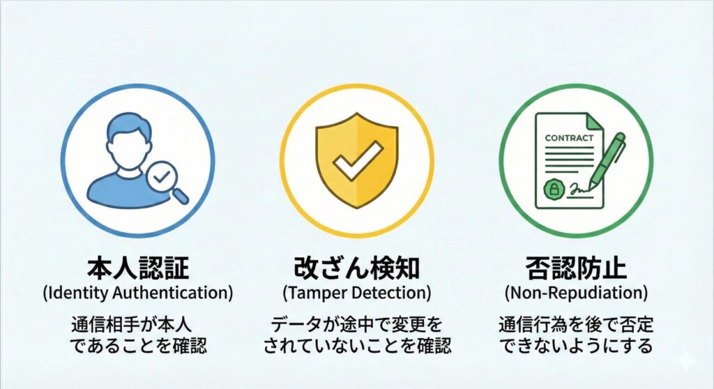 否認防止の実現 通信相手が後になって「通信した覚えはない」と否定できないようにします。デジタル署名により、誰がいつ何を送信したかという証拠が残るため、法的な証拠能力も持ちます。