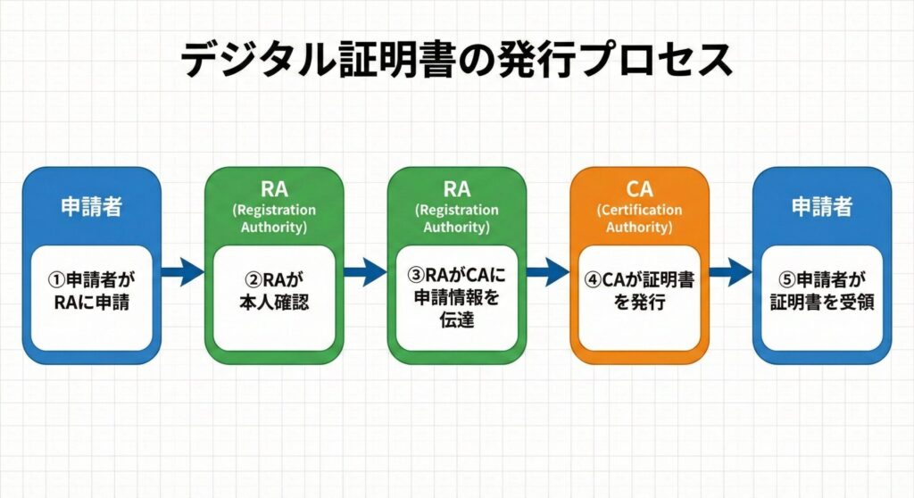 実際のデジタル証明書発行では、以下のような流れでCAとRAが連携します。