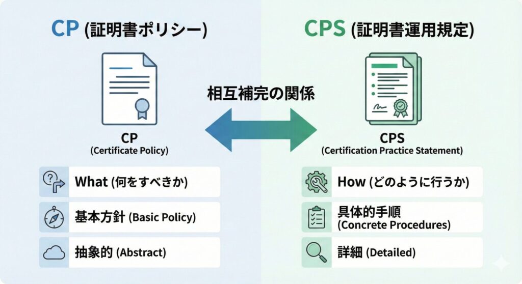 CPとCPSは、互いに補完し合う関係にあります。CPが「何をすべきか」という方針レベルの「What」を定めるのに対し、CPSは「どのように行うか」という実践レベルの「How」を定めています。