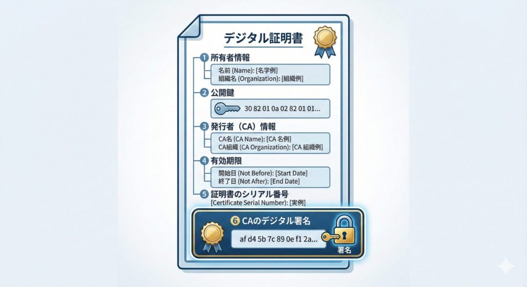 これらの役割は、すべてデジタル証明書を利用することで実現されています。デジタル証明書には公開鍵とその所有者の情報が含まれており、信頼できる第三者機関である認証局(CA)によって発行されるため、高い信頼性が担保されているのです。