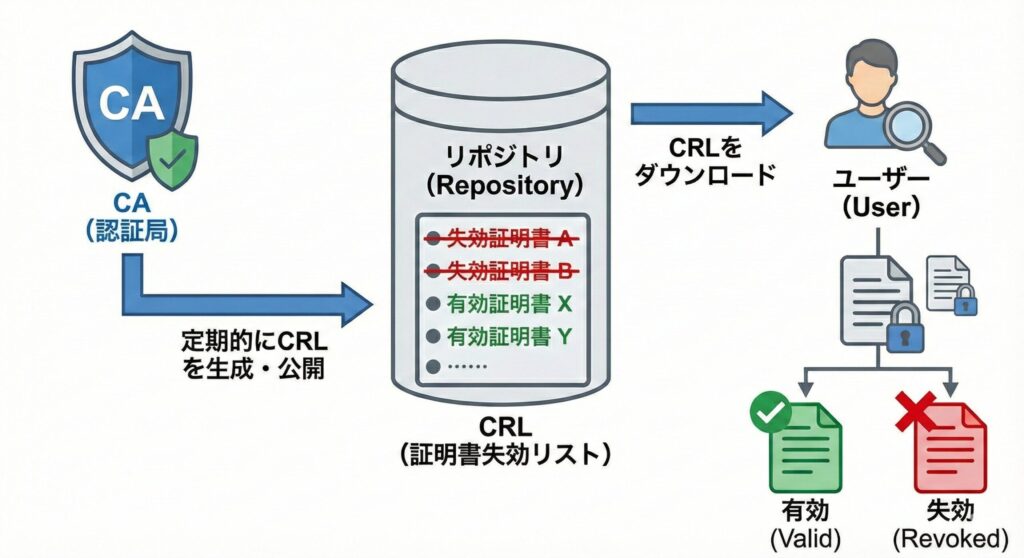 CRL(証明書失効リスト)の発行と公開 何らかの理由で失効したデジタル証明書のリスト(CRL)を定期的に発行し、リポジトリで公開します。秘密鍵の漏洩、証明書情報の誤り、証明書の不正使用の発覚などがあった場合、該当する証明書を失効させ、その情報を広く公開することで、不正利用を防ぎます。近年では、CRLに加えてOCSP(Online Certificate Status Protocol)という、よりリアルタイムな証明書の有効性確認の仕組みも利用されています。