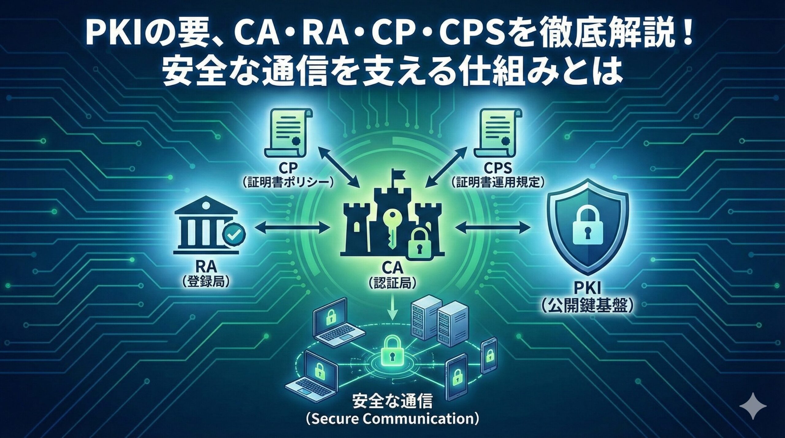 本記事では、PKI(公開鍵基盤)を構成する重要な要素であるCA(認証局)、RA(登録局)、CP(証明書ポリシー)、CPS(証明書運用規定)について詳しく解説しました。