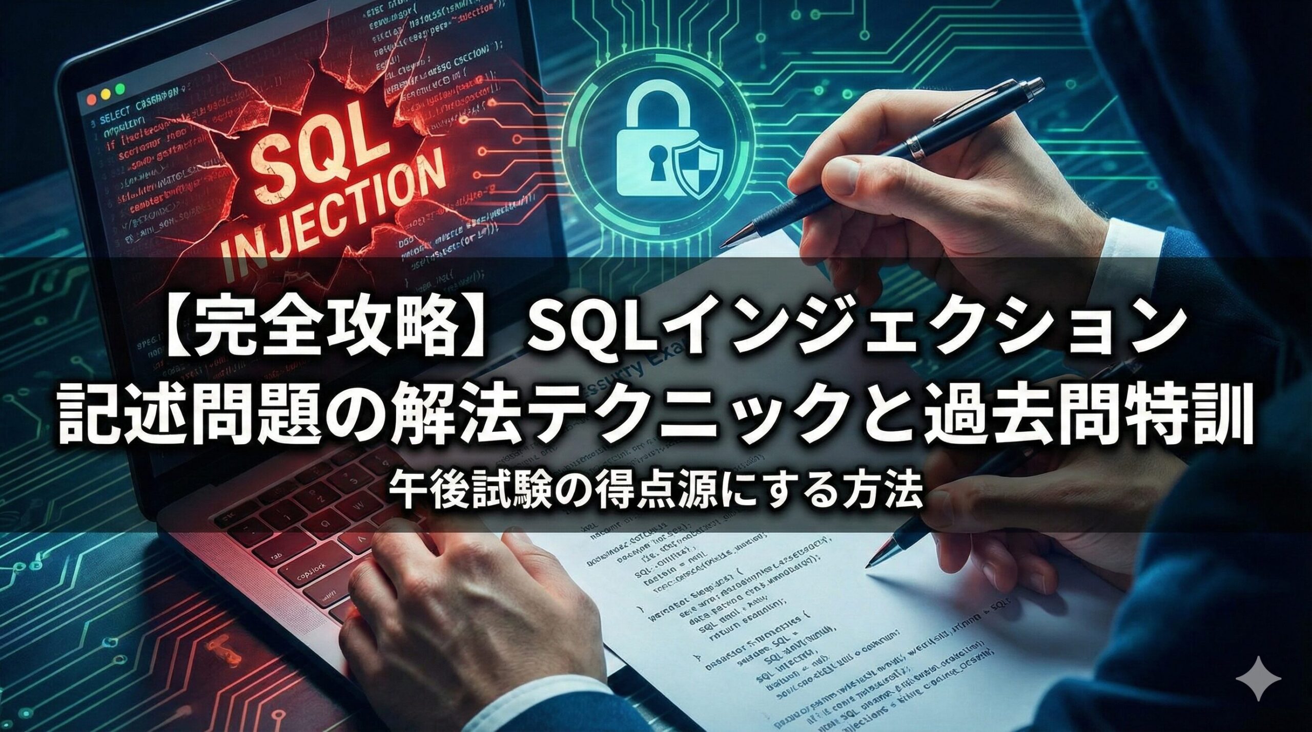 - 過去問演習では、元のSQL文の構造を正確に把握し、攻撃者の意図をパズルのように組み立てる訓練をする。 文字数制約も含めて解答を完成させる練習が、本番での得点力に直結します。
