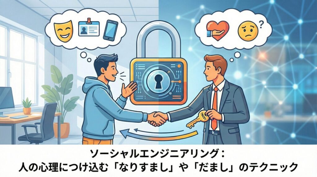 ソーシャルエンジニアリングとは、ネットワークへの侵入やマルウェアの使用といったIT技術を使わず、人間の心理的な隙や行動のミスにつけ込んで、秘密情報を盗み出す手口の総称です。