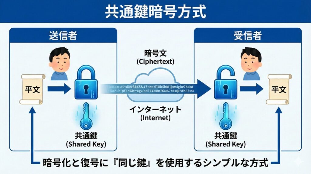 仕組み: 暗号化と復号に**「同じ鍵(共通鍵)」**を使う