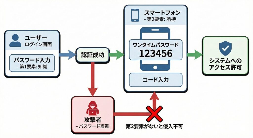 これは「2段階認証(Two-Step Verification)」ではありますが、「2要素認証(Two-Factor Authentication: 2FA)」ではありません。真のMFAは、攻撃者が認証を突破するために「盗む」スキルと「物理的に奪う」スキルの両方を要求することで、攻撃の難易度を劇的に上げます。