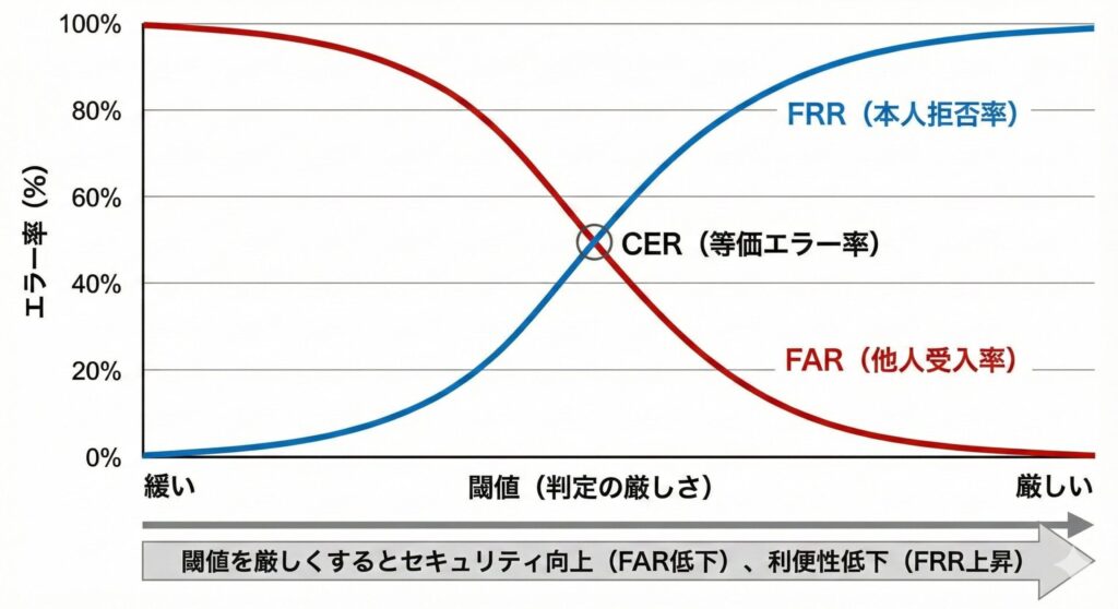- CER(Crossover Error Rate/等価エラー率): FRRとFARが等しくなる点で、生体認証システムの性能評価指標として用いられる