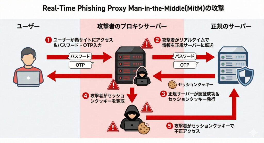 「MFAを導入すれば完璧」かというと、そうではありません。高度なフィッシング攻撃、特に「リアルタイムフィッシングプロキシ」を用いた中間者攻撃(Man-in-the-Middle)は、従来のMFAさえも突破します。