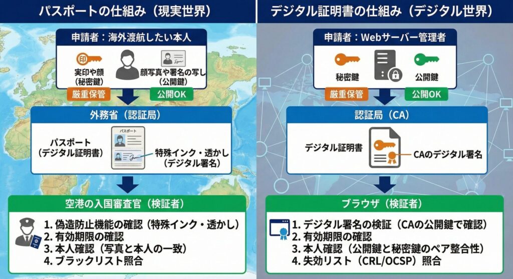 デジタル証明書の動作原理は、パスポートの発行・確認プロセスに例えると理解しやすくなります。